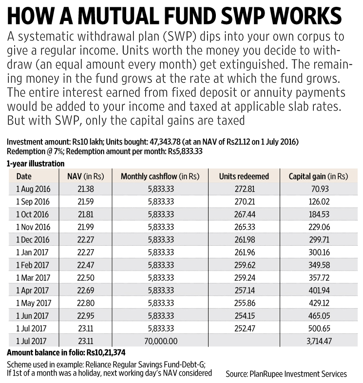 Amol Joshi, founder, PlanRupee Investment Services suggests systematic withdrawal plans (SWPs). An SWP is the opposite of a SIP and all fund houses offer this facility in most of their schemes. Here, you withdraw a fixed sum of money every month. Your fund house extinguishes units at the prevailing net asset value and pays you a fixed sum (see table).
